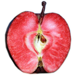 • Fruit : gros, rouge et chair rouge, au goût et à l'arôme subtil et agréable, bon équilibre sucre-acidité. Bonne pomme à couteau.