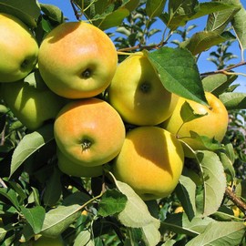 Origine : Semis de hasard, découvert en 1890 au USA par A.H. Mullins. Ce n'est qu'en 1914 que P. Stark de Stark Nurseries en Louisiane, après expertise, lui donna le nom de Golden Delicious.