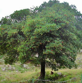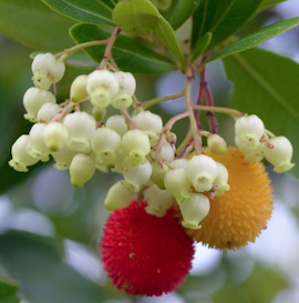 L'arbousier (Arbutus unedo) est un petit arbre ou arbuste de la famille des Ericacées, originaire des régions tempérées du pourtour méditerranéen. Il a une croissance lente reconnaissable à son écorce brune qui se détache avec l'âge. Ses feuilles sont persistantes. Les fleurs blanches en forme de clochettes apparaissent en grappes à l'automne, dégageant un parfum de miel. Les fruits sont des baies sphériques rouges à maturité, à la peau rugueuse et couverte de picots. Ils sont comestibles, avec une chair acidulée, sucrée et farineuse. Particularité, l'arbousier présente fleurs et fruits en même temps à l'automne, les fruits mettant un an pour mûrir.