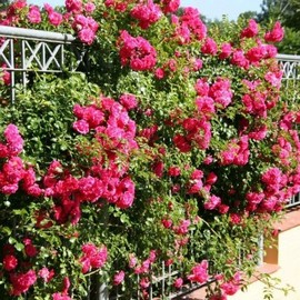 Superbe grimpant à fleurs semi-doubles rouge fuchsia (diamètre fleur 4 à 5 cm). Feuillage vert foncé brillant. Résistance naturelle aux maladies. Floraison abondante et généreuse de juin aux gelées. Très vigoureux et rustique. Résistance aux intempéries et aux hautes températures. Hauteur environ 2,50 m